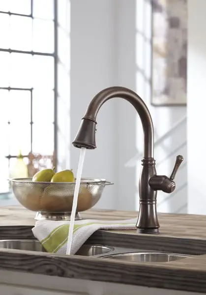 The high-arc, gooseneck design swivels 360 degrees with a 20-in. retractable hose for added convenience during everyday kitchen tasks